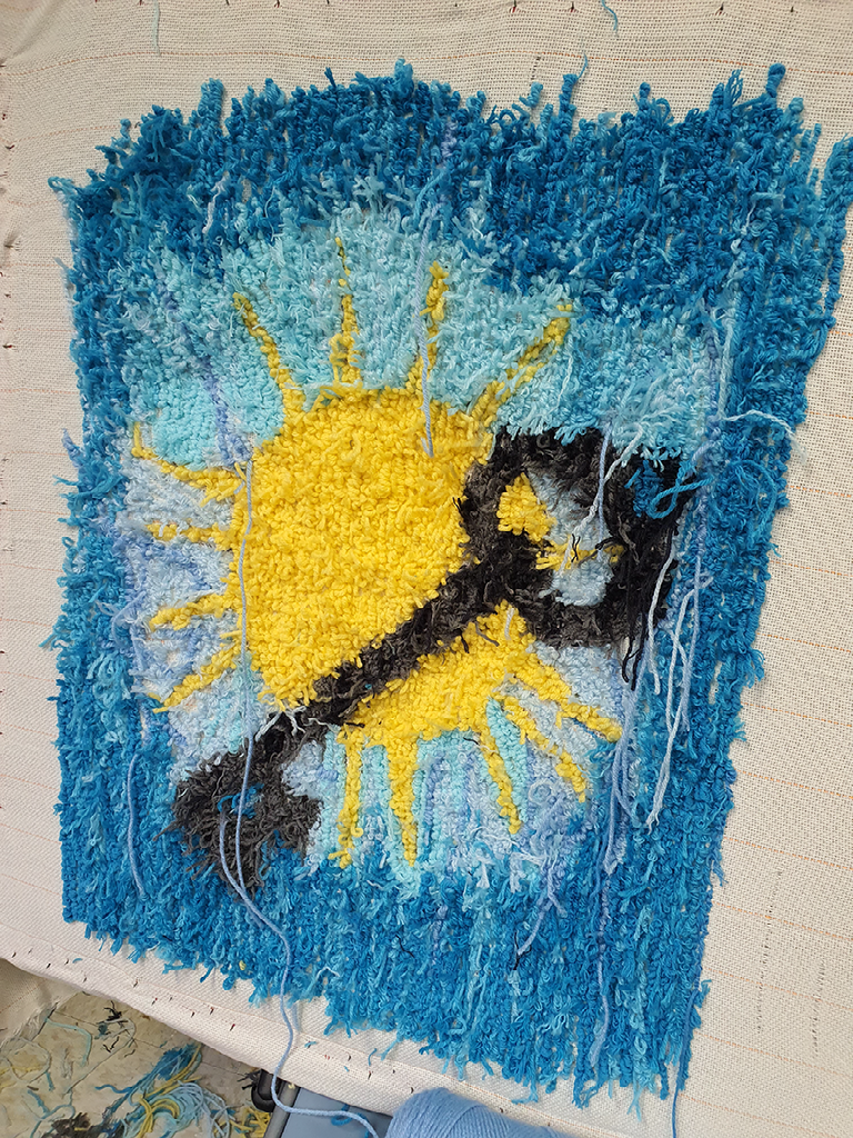 The sunrise in the background of the tufting rug symbolizes the new beginnings and start in the United States. Just as the sun rises every day, it offers a metaphor for renewal and the possibility of a brighter tomorrow. This imagery encourages both refugees and host communities to look forward to the resettlement as a new beginning full of potential.