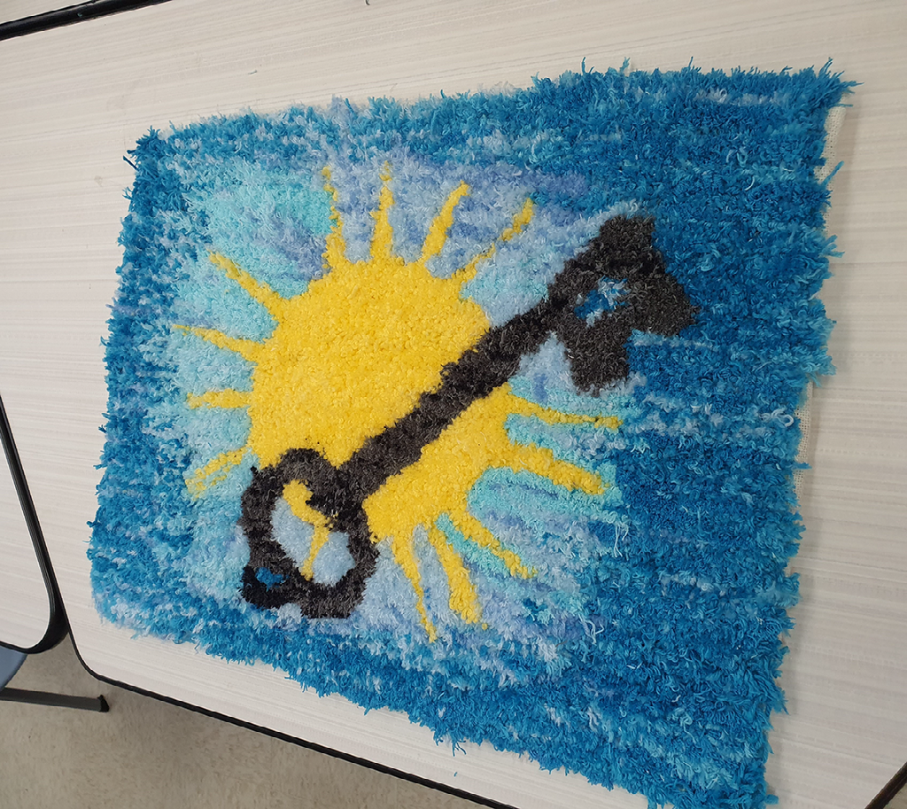 The tufting rug is designed to represent the Middle Eastern refugees in the U.S. The old key and its background of the sun and sky is a powerful storytelling tool that represents the experiences of displacement, hope, and renewal of refugees.